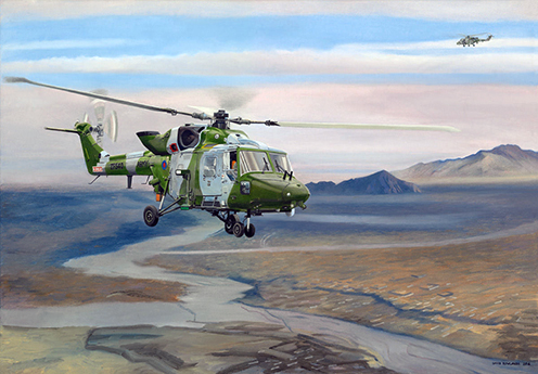 Two Lynx Mk9A helicopters on Operation HERRICK, operating over Helmand Province in the ISTAR* role, are seen ‘in the wheel’, circling anti-clockwise as they observe movements on the ground (either by insurgents or allied troops).
